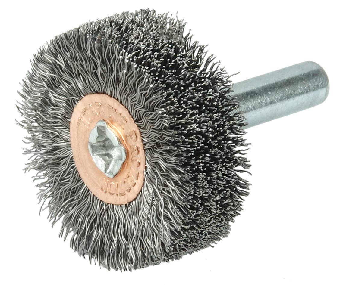 Weiler 1-1/4" Wide Face Stem-Mounted Crimped Wire Wheel provides a flexible brushing action and consistent performance for demanding light-duty cleaning and deburring applications on steel. The permanently-attached 1/4 in stem are primarily intended for use on high speed die grinders. Although they can also be mounted onto a drill, the speed and power of that tool will decrease the effectiveness of the brush. Featuring Weiler's solid ring construction, these radial wheels are available in heat-treated steel, type 302 stainless steel and brass wire. Engineered and manufactured to maximize performance and minimize operating costs in the most demanding surface conditioning applications. The use of superior construction, the highest quality materials and the most stringent manufacturing processes deliver the lowest cost-of-use and most consistent performance in heavy production environments. . Made in USA