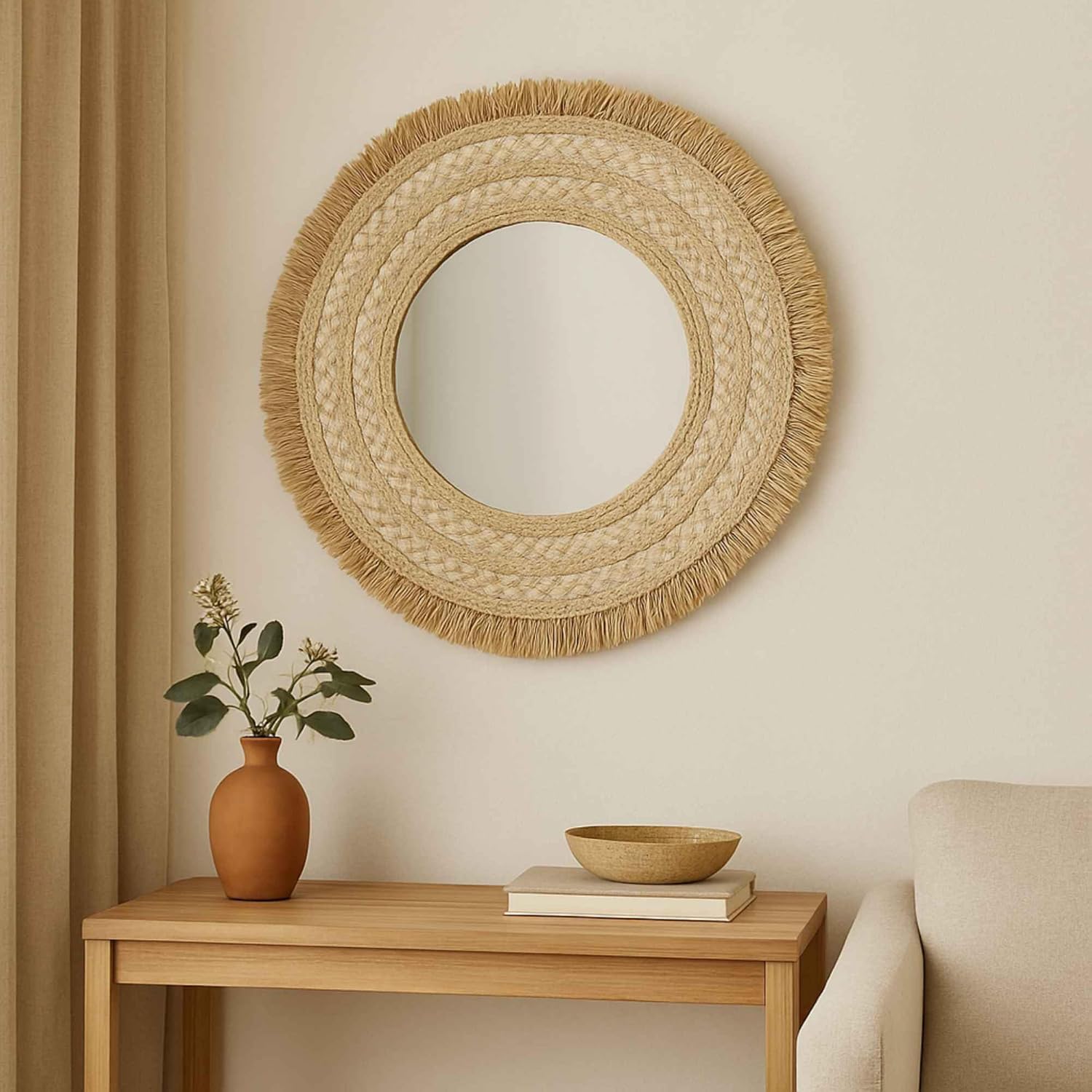 Célia braided mirror diameter 68 cm. Frame material: Raphia. Back Material: Fiberboard Suspension: vertical Mirror material: glass. Frame material: corn fibre