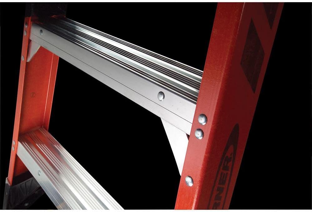 Product Description Stepladder, Material Fiberglass, ANSI Type IAA, Ladder Height 6 ft. , Load Capacity 375 lb. , Number of Steps 5, Base Spread 42-7/8 In. , Bottom Width 25 In. , Step Depth 3 In. , Step Tread Ribbed, Series 7400, Includes Drill Holster for Added Convenience From the Manufacturer This extra heavy duty fiberglass stepladder has a 375 pound duty rating (type IAA). It is made of nonconductive fiberglass rails for added safety in case of electrical hazards. It has heavy duty aluminum internal Pinch-Proof spreaders and triple riveted Traction-Tred steps with a knee brace on every step and horizontal cross brace. Heavy gauge aluminum top and side plates are attached with 4 solid rivets to each front rail. Nonconductive rail shields reinforce bottom ends for increased resistance to damage. Every rivet is backed up by a metal part or washer. Includes extra wide slip resistant Traction-Tred steps.