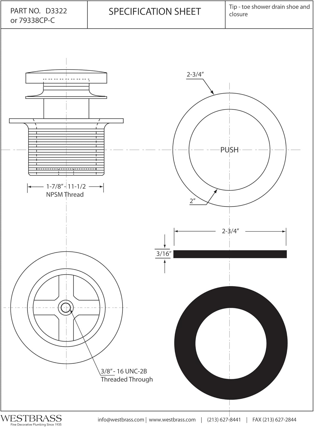 Product Description This Westbrass, ADA approved bathtub drain and stopper, replaces existing bath drains and provides positive closure. Designed for coarse thread, 1-1/2 NPSM drains. Solid brass shoe with plastic and brass stopper stem. Easily opened and closed by pressing the stopper. NOTE: Be sure to measure to assure correct size drain shoe (Coarse or Fine). Available in a variety of stylish finishes, this item is sure to complement your existing fixtures. Be sure to check out our other model styles and VISIT OUR WESTBRASS STOREFRONT for more Kitchen and Bath items to stylize your home with convenient functionality and beauty. From the Manufacturer Westbrass was founded in 1935 by two brothers, to serve the needs of all plumbing wholesalers on the West Coast. The product lines at the time included items such as faucets, valves, malleable fittings, etc. After becoming the premier distributor of plumbing products, the company was bought in 1985 by Max Homami. Seeing a boom in the Home Improvement Industry, Mr. Homami had a vision to make Westbrass the leader in Kitchen & Bath Accessories.The company currently manufactures its own products made of the highest quality materials. In order to ensure the excellence in the industry, these products are made to pass the highly stringent requirements of NSF, IAPMO, ADA and many other regulations. The Los Angeles-based company now sells a wide range of Plumbing Specialty Products, Bath Waste & Overflows, as well as Decorative Kitchen & Bath Accessories worldwide. Westbrass holds several patented items including the Deep Soak Overflow designed for extra-deep soaking in most bathing-wells, the Closing Linear overflow and several other intellectual properties. The customer base includes kitchen & bath showrooms, plumbing wholesalers and supply houses, OEM and ODM companies, as well as several national home centers.