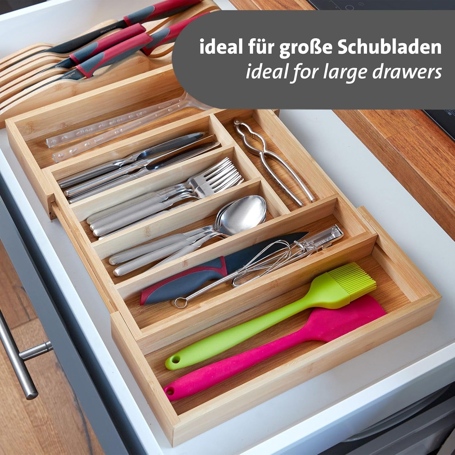Westmark Cutlery Tray for Drawers - Practical Organisation for Your Kitchen The Westmark cutlery tray for drawers is the ideal solution to keep your kitchen utensils and cutlery tidy and within easy reach. This extendable tray provides 5 or 7 compartments to keep your cutlery and other kitchen tools neatly organized. Reliable kitchen helpers Thanks to the clever and extendable design, the cutlery tray fits in all standard kitchen drawers and ensures order and comfort in your kitchen. With 5 or 7 chambers, you have enough space to organise your cutlery and other kitchen utensils neatly and always have them at hand. The cutlery tray is made from high-quality, sustainable and renewable bamboo. This environmentally friendly material gives your kitchen interior a natural elegance while being extremely stable and durable. The handling and care of the cutlery tray are uncomplicated. The liner can be easily removed from the drawer and cleaned to ensure a hygienic environment. The extendable design allows you to easily adjust the insert to the size of your drawer. We take responsibility The energy and performance efficient production of kitchen utensils has been the core of our self-concept since 1956. As a certified production company, we guarantee the highest quality standards and regularly put all processes to the test. So we take responsibility - for a clean future! Features at a glance: 5 year warranty Material: bamboo (BAM). Hand wash recommended.