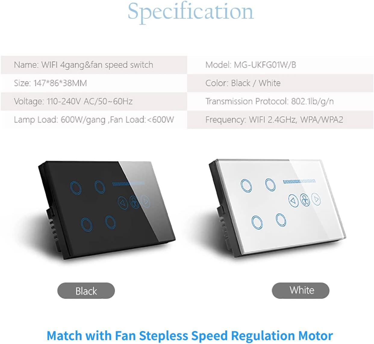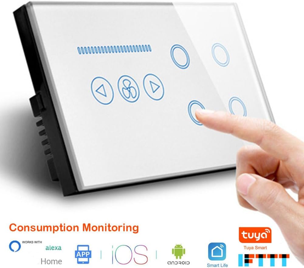 This touch switch supports the maximum power of 2200W, which can work with most lights and other electrical devices, connect to your smartphone and control your home appliances with ease. The user can control this Wi-Fi plug-in via the voice via the (Echo / Dot / Dot / Tap / Assistant / Home / IFTTT) device to turn off the switch whose support timer function (works in offline state) that includes countdown; single and repeat timers can be Set Max. 8 groups of timers Through smart speakers and smart voice assistants(Echo / Dot / Dot / Tap / Assistant / Home / IFTTT)voice control is achieved. Flight ticket counter to turn your lights on or off with your voice, No hub required The intelligent timer switch will automatically turn on after setting a timer for this switch, which is essential for daily scheduling, and bring you a comfortable and intelligent lifestyle. Tempered glass touch screen of this diy smart switch is sensitive to the touch of control, premium durable glass material provides up to 20 million touch figures through our rigorous testing This smart dimmer fault switch supports stepless dimming for lighting or adjustable ceiling fan speed, 4 dimming options, APP remote control, timing adjustment, special overload protection design a security in the household. 1. You can open / close ceiling fans or other types by opening / closing your voice or mobile app. 2. You can also set the fan speed directly by switching, and the physical buttons provide good touch and responsiveness. 3.The dimmer switch calibrates the electric fan you use so that it is gently turned on and gently closed for a comfortable visual effect, and it can provide the maximum speed setting range without flashing. This Smart Dimmer Switch can not only be used to control the ceiling fan, please make sure that your fan is connected and adjustable before ordering and use, it can also be used for dimming light.