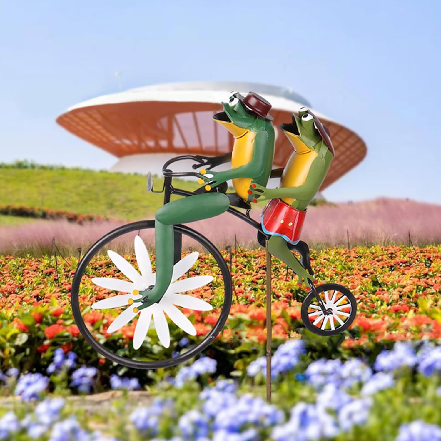 Description: Cute animal on a motorcycle statue, a delightfully fanciful garden decoration with a unique spin when the wind blows.Seeing the novel windmill, will feel happy. A unique frog wind spinner that makes you smile every time you see it. This wonderful, whimsical garden art features two colourful frogs on an old-fashioned penny-style with a unique design. The Wind Spinner can be easily inserted into the soil or grass without any tools, just place it in your garden and enjoy your happy hour. This adorable handcrafted garden decor is ingeniously designed to capture the wind through the spokes giving it a lifelike movement! The animal will start pedaling on windy days. This is a good lawn decoration. Features:. Wind Spinners for Garden. -Color: As shown. -Material: matal. -Size: about 28x75 cm/11.02x29.53 inch. Note: Manual measurement, please allow slight errors on size. The colors may exist slight difference due to different screens. Package Including 1 * Wind Spinners for Garden