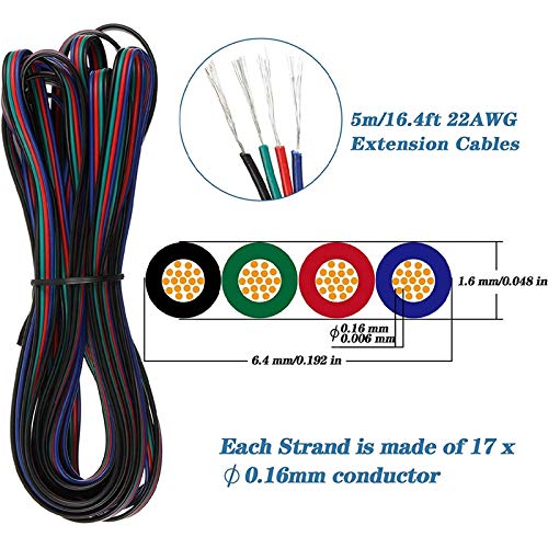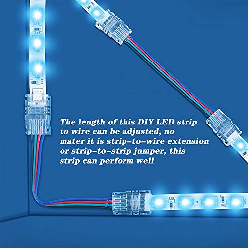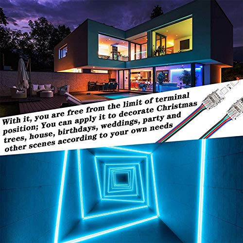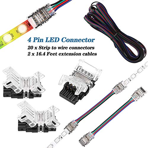Easy and fast connection: with this LED light strip connector, you may connect easily the strip to wire, without need of stripping insulation or soldering, or peeling off waterproof cover, which is simple and effortless to use, and can save your much time and energyFor waterproof LED light: this LED connector kit is suitable for IP65 waterproof 10 mm 5050 5630 RGB 4 pin LED strip light with 30 - 120 LEDs, suitable for 22-20 AWG solid and strand wire. The reliable PVC plastic wire cover as well as tin plated copper core allow you to use the 4 pin connectors kit safely and stably for a long timeSuitable working condition: the 4 pin LED strip connector kit is great for 5v, 12v, 24v LED strips, stands up to 5A ( R,G,B 3 channel ) current carryingWidely applicable: the length of this For DIY LED strip to wire can be adjusted, no mater it is strip-to-wire extension or strip-to-strip jumper, this strip can perform well. With it, you are free from the limit of terminal position. You can apply it to decorate Christmas trees, parties, birthdays, weddings, parties and other scenes according to your own needsModel Number: LED Strip ConnectorMax Current: 5AWorking Voltage: DC3-24VApplications: For 2812 3528 5050 Stripcolour:BlackMaterial:nylonPackage includes:20 x 4 pin LED connectors2 x 5 m extension cablesOnly the above package content, other products are not included.Note: Light shooting and different displays may cause the color of the item in the picture a little different from the real thing. The measurement allowed error is +/- 1-3cm.