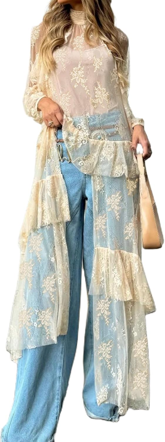 Women Sheer Long Sleeve Lace Duster Robe See Thru Mesh Short Front Long Back Casual Flowy Top Asymmetrical Coverup