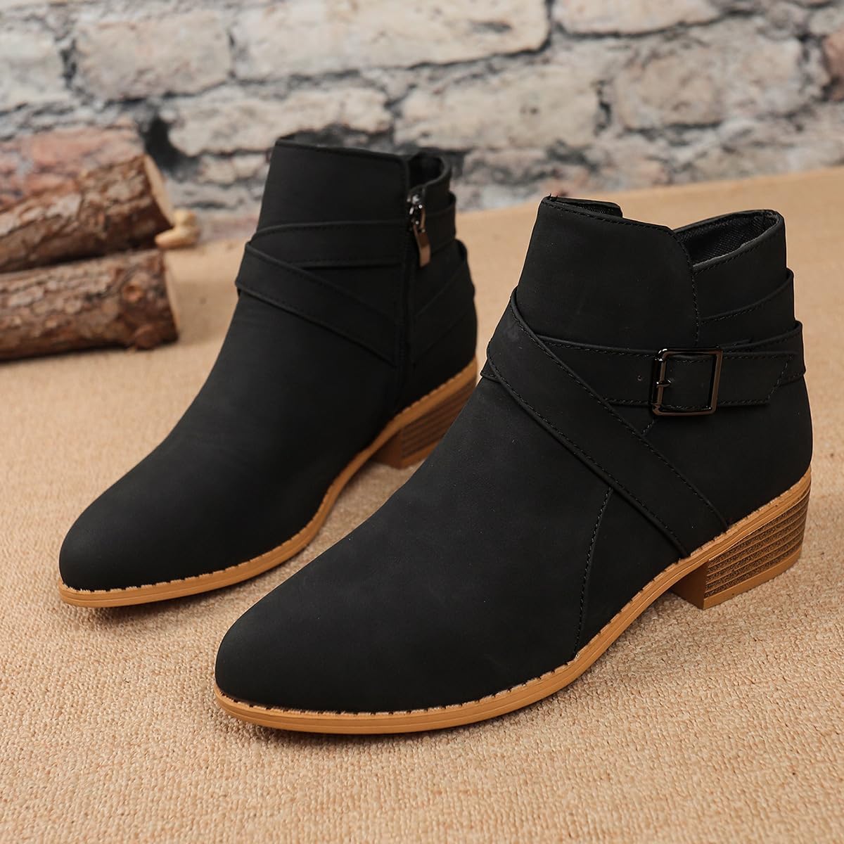 Upper Material: Microfiber Shaft Material: Cloth Shaft Lining Material: Cloth Sole Material: Rubber Heel Height: Mid (3-5cm) Shaft Height: Low Heel Shape: Block Fashionable Elements: Belt Buckle Closure: Side Zipper Toe Shape: Pointed Suitable Season: Autumn, Winter, Spring Style: Retro