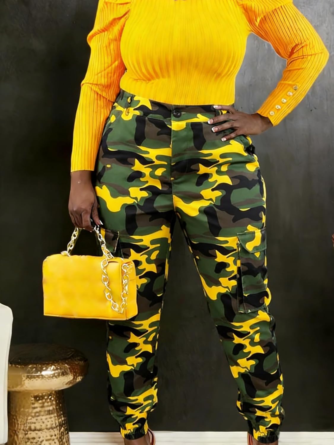 Elevate your style with these women’s camo cargo pants. Featuring a flattering high-waisted design, these pants enhance your waistline while offering a comfortable slim fit.The bold camouflage pattern combined with functional cargo pockets creates a stylish yet practical look. Crafted from soft, breathable fabric, they are perfect for everyday wear, casual outings, or night out styling.Pair these jogger-style cargo pants with heels, sneakers, or boots for versatile looks that transition effortlessly from day to night.