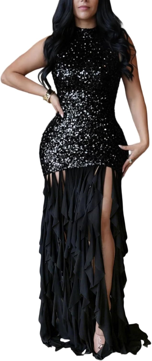 Women's Elegant Sequin Dress Sparkly Glitter Sleeveless Mock Neck Flowy Ruffle Hem Bodycon Tassel Maxi Cocktail Party Gowns Product information: Package content: Dress *1 Material: Polyester + Spandex Season: Summer Pattern Type: Stripe on side Style: Casual, Street Color: Black, Wine, Green Size: S, M, L, XL, 2XL Please check size chart before you buy it, and consider your body shape and your dressing habits. S:--Bust: 29.92"--Waist: 25.20"--Hip: 32.68"--Length: 61.02" M:--Bust: 31.50"--Waist: 26.77"--Hip: 34.25"--Length: 61.42" L:--Bust: 33.86"--Waist: 29.13"--Hip: 36.61"--Length: 61.81" XL:--Bust: 36.22"--Waist: 31.50"--Hip: 38.98"--Length: 62.20" 2XL:--Bust: 38.58"--Waist: 33.86"--Hip: 41.34"--Length: 62.60"