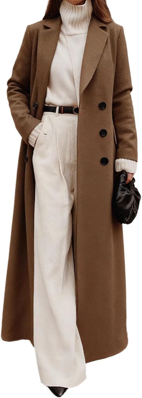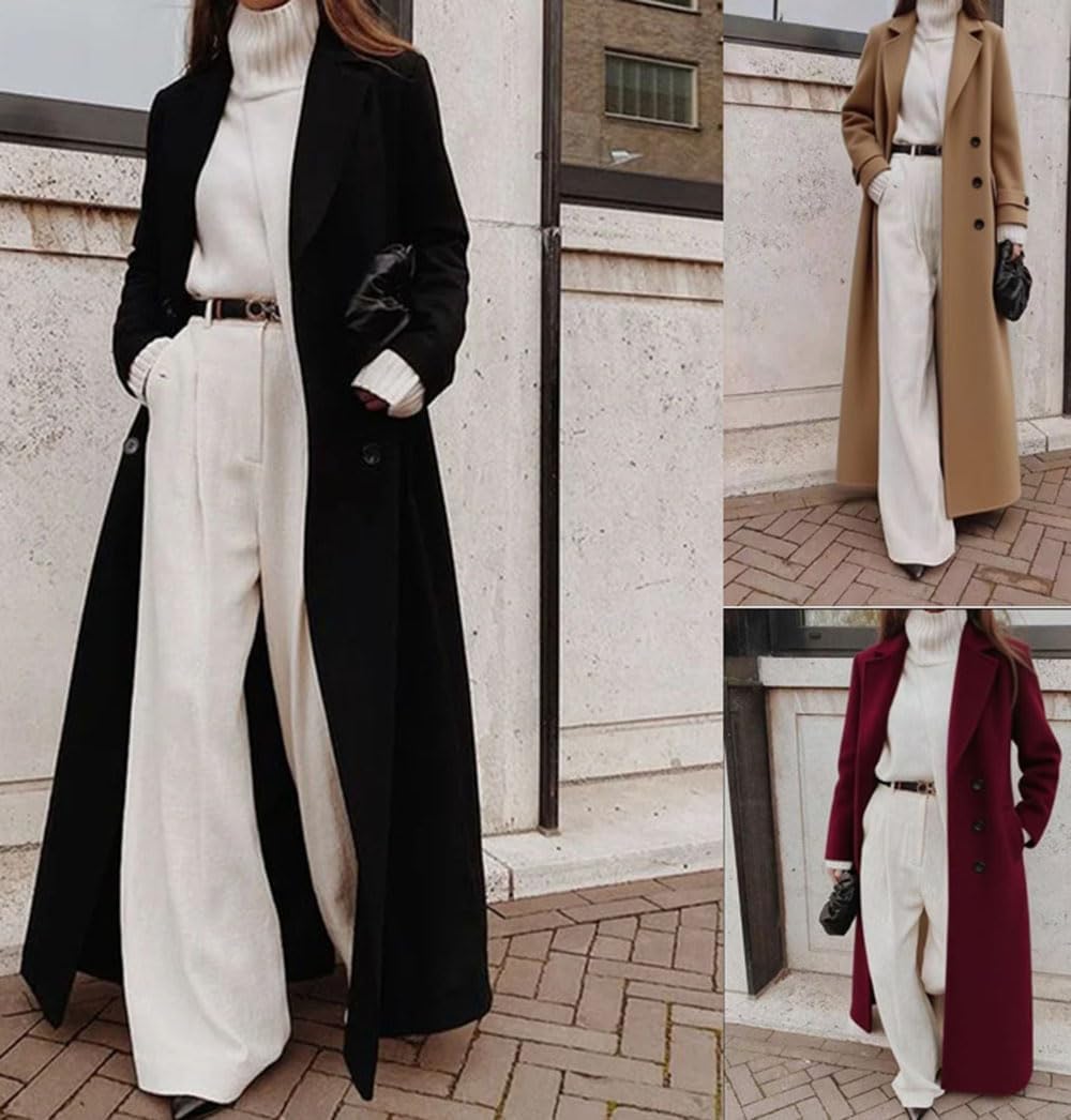 This sophisticated women's long wool coat combines timeless elegance with modern versatility. Featuring a classic double-breasted design with button closure, this full-length outerwear piece creates a flattering silhouette that works beautifully for both professional and casual occasions. The tailored fit and structured lapels provide a polished look, while the generous length offers excellent coverage and warmth during colder months. Available in multiple sophisticated colors including classic black, rich burgundy, elegant camel, and deep forest green, this coat pairs effortlessly with everything from tailored trousers and turtlenecks to dresses and boots. The quality construction and refined details make this an essential wardrobe staple that transitions seamlessly from day to evening wear.