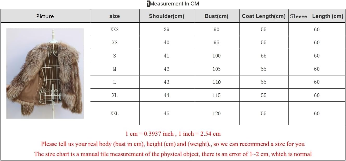100% Real Fox Fur Coat, fashion, luxury, Warm, Material: 100% Real Fox Fur Lining material is polyster Please choose coat bust size 10 cm( 3.9 in) larger than your body's bust Sleeve length is 60 cm (23.62 in) Coat length is 55cm( 21.65 in) size XXS:bust 90 cm (35.43 in) size XS :bust 95 cm (37.4 in) size S: bust 100 cm (39.37 in) size M: bust 105 cm (41.33 in) size L : bust 110 cm (43.3 in) size XL : bust 115cm (45.27 in) size XXL : bust 120 cm (47.24 in)