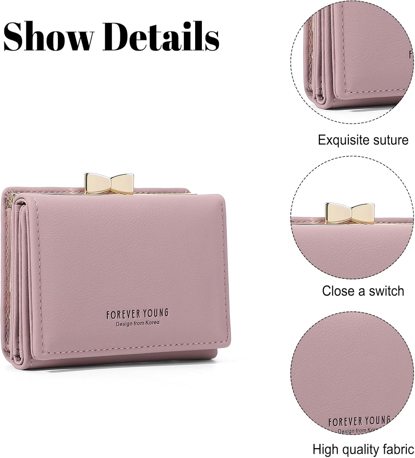 Women Purse Small Wallet PU Leather Trifold Wallet with Coin Purse/ID Card/Card Holder, Coin Pocket with Button Closure Women's Zip Wallet Purse Women Coin Purse Money Bags with Zipper Christmas Birthday Gifts for Women Girls High-quality craftsmanship - women's wallet Specification: Item type: leather wallet for women/girls. Material: PU leather. Closure: zip. Size: 11 cm (L) x 8 cm (W) x 3 cm (H) Colors: Light Pink, Black, Blue, Dark Pink, Brown Structure: 7 card slots (2 ID and photo windows), 1 coin pocket with button closure, 1 main pocket for bill Features: High quality ladies wallet Classic and practical, small and portable and stylish Practical and multifunctional Available in various colours. It is a wonderful gift for lovers, friends and family