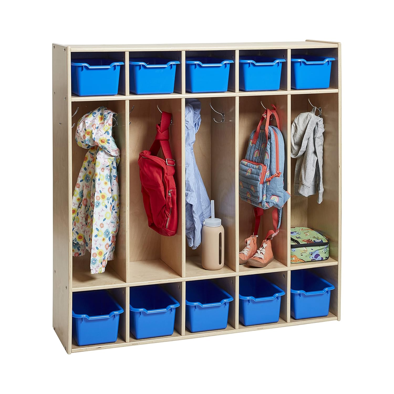 Maximize space and keep your school organized and clutter-free with the ECR4Kids Streamline 5-Section Coat Locker with Scoop Front Bins. The wooden locker features five long compartments with 10 double coat hangers for sweaters, backpacks, and umbrellas. Give children their own separate cubby storage to keep art projects, homework, and personal belongings organized. Durable plastic bins feature rounded edges, an easy-to-grasp scoop front handle, and a curved interior to simply remove contents. Use in a classroom for students to store jackets, lunchboxes, and school supplies or in a children’s bedroom to organize dress-up clothes, costumes, accessories, hats, gloves, and more. The low-profile open-face shelves encourage children to care for their belongings and clean up independently. The drop-and-go storage is constructed from sustainably harvested birch plywood with a tough UV lacquer that seals the wood surface and resists scratching. A UV inhibitor makes furniture resistant to ultraviolet light and yellowing. Natural birch plywood is extremely durable and will hold up to everyday use in a daycare, or preschool, and is great for the home. Combine the Montessori storage with other ECR4Kids Birch Collection furniture pieces to complete the space.