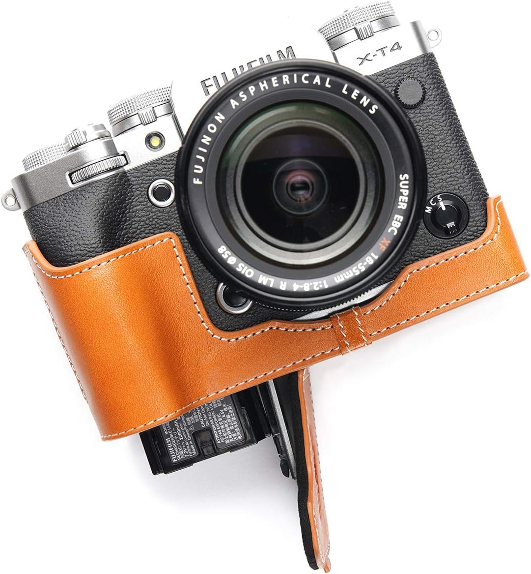 This camera is made by real top layer oil leather, the design is simple and vintage, use Metal sizing techniques make it very fit with the camera body. Inside lining use high lever velvet to protect camera body for scratch and coloration. There is a opening on the bottom for battery, You don't need to take off the half case when you change battery. Under base screw is made by copper and it can easy take off by coin. You don't need to take off the half case when you use tripod. It has a special design for Fujifilm Fuji X-T4 XT4 Camera which makes it easy to turn over the Screen and it will totally not affect screen rotation. You don't need to take off the half case when you connect data lines. Content: 1 x camera half case, 1 x Free Genuine Real Leather Hand Strap, camera not included. Material:Genuine leather.