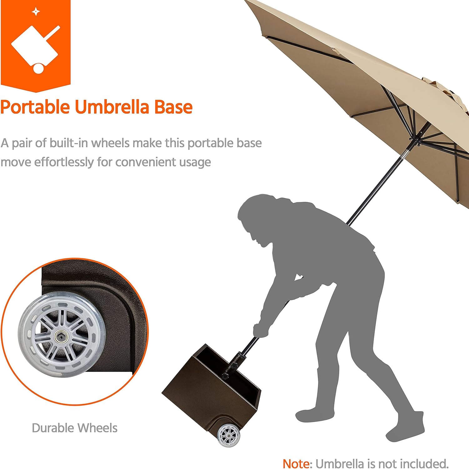 9FT Patio Umbrella 8 Ribs Market Umbrella w/ Push Button Tilt and Crank + Portable Metal Umbrella Base Stand for Outdoor Patio Garden Backyard MarketDescription: It would be a waste if we don’t go out and enjoy the beautiful weather. But sometimes things may get a little bit awkward especially when the sun becomes unrelenting. The market umbrella can be effortlessly opened and closed with a hand-crank and easily tilted in 2 directions with a push at a button. Our free-standing umbrella base has a solid metal structure, featuring sturdy and durable. Rust-resistant powder coating ensures a long lifespan in all weathers, the color does not come off easily. Fillable planter box allows customers to plant and DIY the greenery or decoration of another kind according to their needs. This basic outdoor umbrella with a portable stand is a functional addition to the patio, garden, deck, poolside, café and restaurant.Specifications of Patio Umbrella:Canopy Color: TanMaterial: 180g Polyester, Powder-Coated IronUmbrella Rib Qty.: 8Canopy Diameter: 261cm/9ftOverall Height: 240cm/7.9ftUmbrella Pole Diameter: 3.8cm/1.5”G.W.: 5.8kg/12.8lbSpecifications of Umbrella BaseMaterials: IronColor: BrownOverall Dimension: 48×45×40cm/19×18×16’’(L×W×H)Umbrella Pole Diameter: 5.6cm/2.2’’Compatible Pole Size: 3.8cm/1.5’’, 4.8cm/1.9’’G.W.:12.3kg/27.1lb ; N.W.:10.5kg/23.1lbNote: Please allow ±1cm/0.5’’inch errors in seat height due to manual measurements.Package included:1 x Patio Umbrella1 x Instruction of Umbrella1 x Umbrella Base1 x Instruction of Umbrella Base1 x Hardware Package