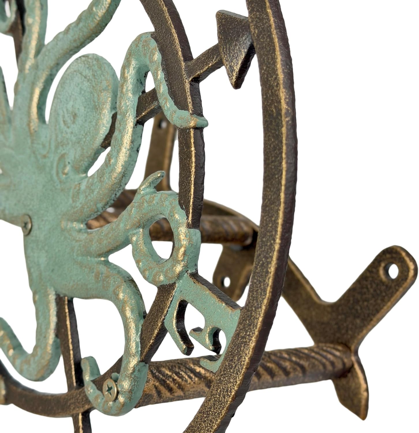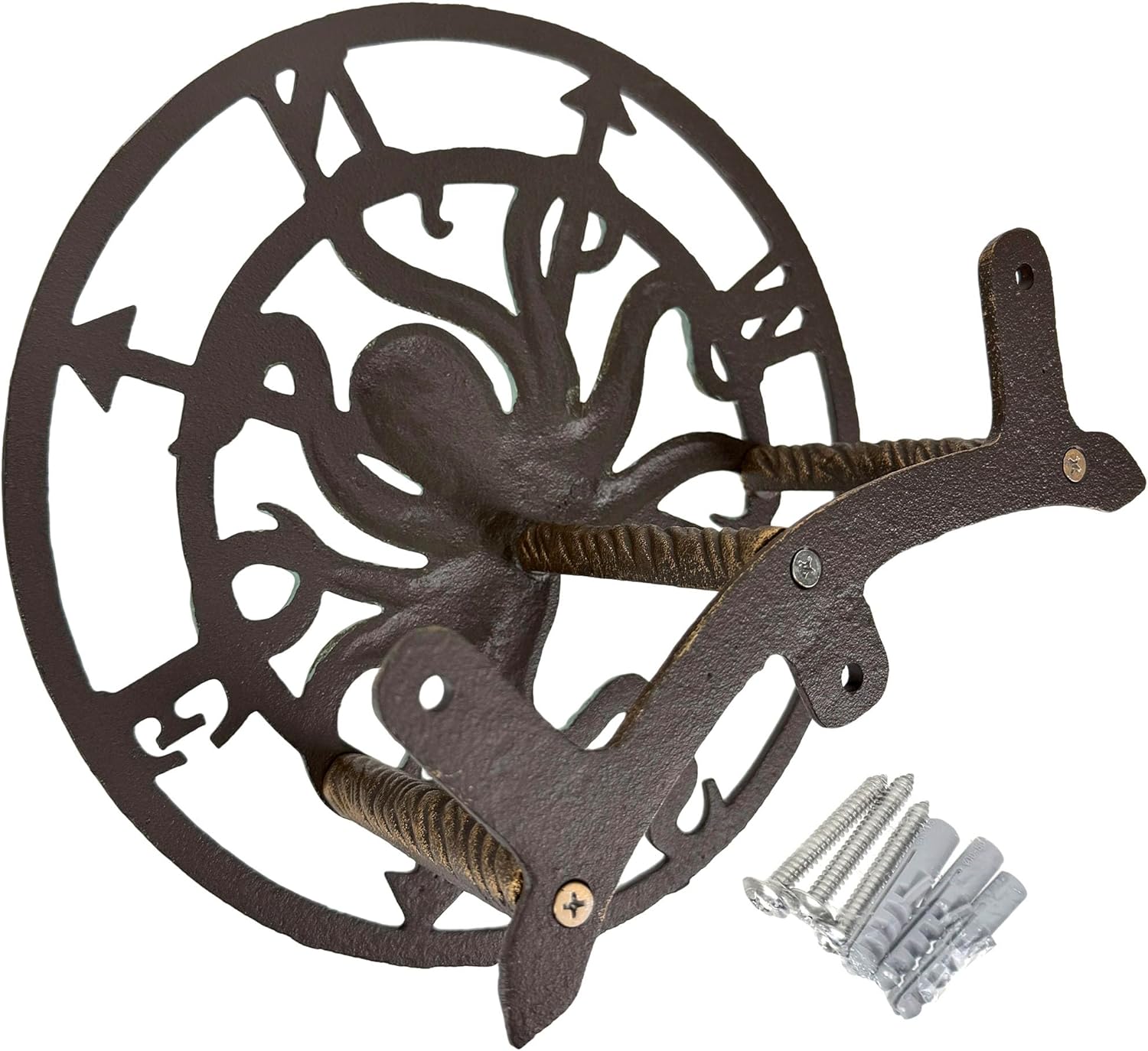 This 11.75 inch cast iron octopus compass rose garden hose holder adds sturdy nautical style and decorative wall storage to your yard, garden, or beach house. Blending a bronze finish with a verde patina octopus, it works as both an outdoor hose hanger and a piece of maritime wall art, ideal for nautical garden decor or coastal hose storage by your spigot. The compass rose, sometimes called a wind rose, brings classic seafaring charm to patios, docks, or seaside cottages. Measuring 11.75 inches high and 11.75 inches wide, with a 5.5 inch deep arm, this compact hose rack fits nicely on fence posts, near garage doors, or beside an outdoor faucet. The circular face keeps most standard garden hoses neatly coiled up and off the ground, helping reduce kinks, tangles, and trip hazards while keeping your landscape tidy. Solid cast iron construction gives this decorative hose holder a substantial feel and durability for outdoor use. The bronze finish with verde patina highlights the octopus and compass details, adding aged coastal character that suits many exterior color schemes. Integrated keyhole-style mounting holes and included painted screws make installation straightforward on most wood walls, posts, or fences. To care, simply wipe with a soft cloth or rinse lightly with water as needed. The coastal compass and octopus design makes this hose hanger a natural fit for beach-inspired gardens, lake houses, seaside patios, or nautical themed backyards. Mount it near your hose bib, by a dock, alongside a boathouse, or on a garden wall to blend practical hose storage with eye-catching coastal décor. Perfect for beach lovers, boaters, and avid gardeners, this cast iron hose holder makes a thoughtful housewarming, birthday, or holiday gift. Hose is not included, allowing the recipient to pair it with their preferred standard garden hose for a coordinated outdoor look.