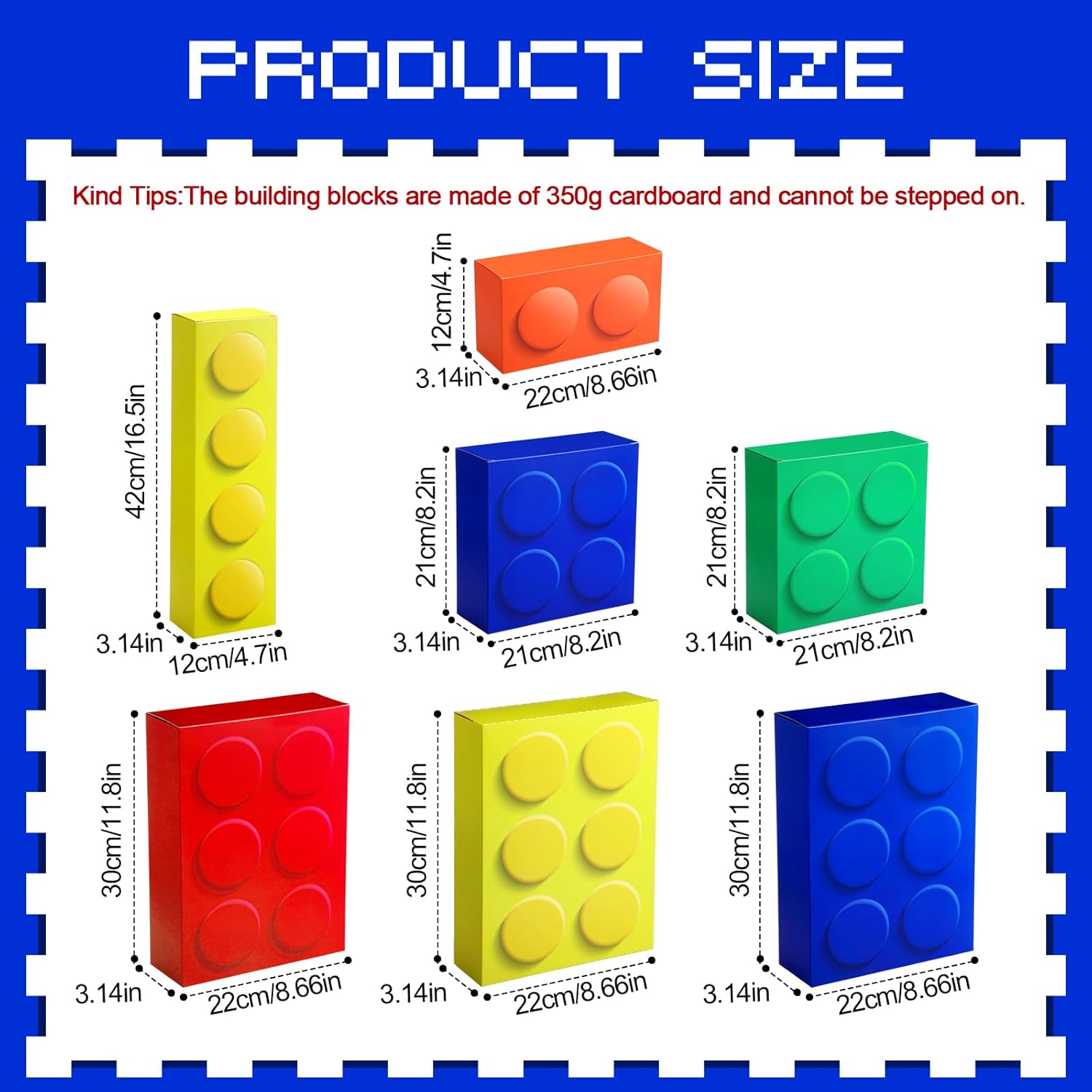 Features: Ideal Gift Choice: These cardboard building blocks make a nice gift for kids who love building blocks. Application Occasions: This set is the ideal decoration for kids' activities, birthday parties, friend get togethers, and more. Specifications: Material: cardboard and glue Color: yellow, orange, blue, green, red Size: Yellow: 16.54" x 4.72" x 3.15" and 11.81" x 8.66" x 3.15" Orange: 8.66" x 4.72" x 3.15 " Blue: 8.27" x 8.27" x 3.15" and 11.81" x 8.66" x 3.15" Green: 8.27" x 8.27" x 3.15" Red: 11.81" x 8.66" x 3.15" Package includes: 8 x Yellow building blocks boxes 4 x Orange building blocks box 8 x Blue building blocks boxes 4 x Green building blocks box 4 x Red building blocks box Notes: Manual measurement, please allow slight errors on size. The color may exist a slight difference due to different screen displays. Suitable for people over 6 years old, and it's recommended to use under the supervision of adults in case of choking risk