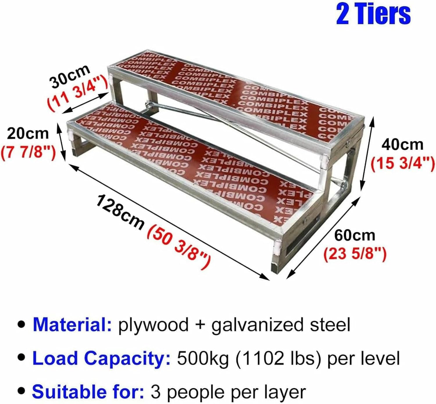 ❁ Our choir steps provide performance support for groups of all sizes, offering an effortless and elegant to every show.❁ Specification:- Material: Plywood + Galvanized Steel- Tiers: 1/2/3- Capacity: 3 people per tier- Weight-bearing: 500kg (1102 lbs) per tier- Size: 128 x 30 x 20cm (50 3/8" x 11 3/4" x 7 7/8"), 128 x 60 x 40cm (50 3/8" x 23 5/8" x 15 3/4"), 128 x 90 x 60cm (50 3/8" x 35 3/8" x 23 5/8")❁ Feature:- lasting strength, unbreakable.- Anti-slip surface ensures safety.- Supports three people per tier.- Quick assembly saves time.- For classroom, commercial, show.- For concert hall, group picture, theatres. ❁ Package Contents: 1 x Choral Risers❁ Please Note:- Due to the light and screen difference, the item's color may be slightly different from the pictures.- There may be slightly deviation in dimensions due to manual measurement. Thank you for your understanding.