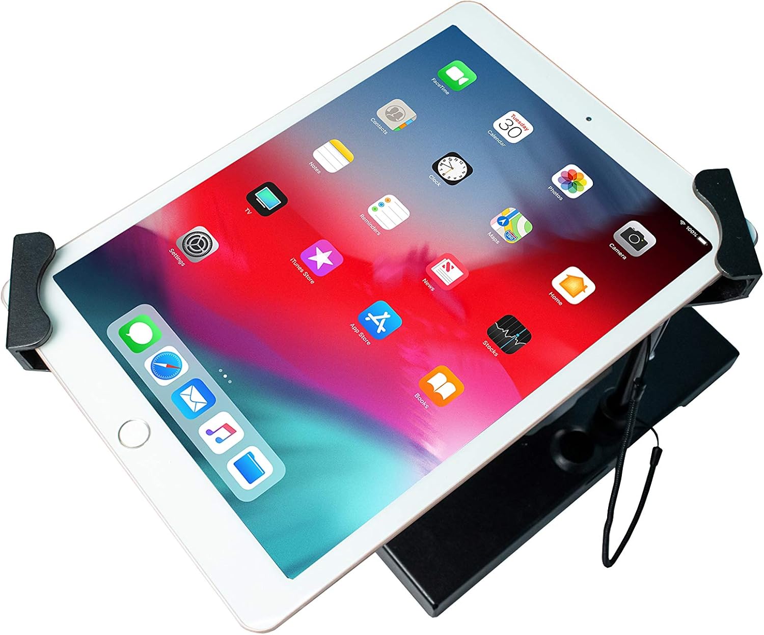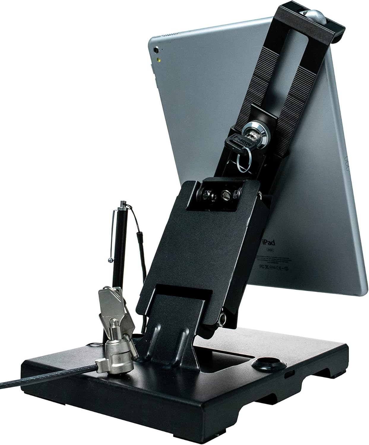 This inventive, locking tablet stand gives you unbeatable anti-theft protection Plus expansive angle adjustment options. Optimized for space-saving, the stand can fold nearly flat against your countertop surface or wall, or adjust to a fully upright position. The sturdy metal neck features a pair of flexible hinges, while the tablet holder is outfitted with 360 Degree rotation for easy portrait and landscape displays. The holder also offers a powerful lock and key security system Plus a galvanized steel security cable that attaches to the stand's base or the back of the holder. The padded stand base can be mounted to your countertop with included hardware. Features: angle-adjustable neck folds nearly flat or stands fully upright locking holder protects tablet from theft holder rotates 360 degrees for portrait and landscape displays allows access to device's ports, cameras, buttons, and headphone jack locking steel cable attaches to base or back of case for additional measure of protection Compatible with 7-14 inch tablets including iPad 10.2-inch (7th & 8th Generation), iPad Air Gen 4 (2020), iPad mini 5, 12.9-inch iPad Pro, 11-inch iPad Pro, iPad mini, iPad Gen. 6 (2018), iPad Pro 12.9, Galaxy Tab S3 9.7”, and more Compatible with headphone jack credit card readers. *CTA Digital's security products are designed to protect your device from theft. Products are made with high-quality materials, like reinforced heavy aluminum slots, steel cables, and secure lock-and-key systems. Where CTA Digital makes every effort to protect against destruction of or loss of property, we cannot guarantee, and cannot be responsible for any event that leads to the damage or theft of a device. Specifications: weight: 3.28 lbs. Dimensions: 10” x 8.25” x 7.25” base Dimensions: 8.25” x 6.25” security cable length: 78 inches Package contents: (1) tabletop security stand (1) Set of mounting hardware (2) holder keys (2) cable keys (1) Security cable