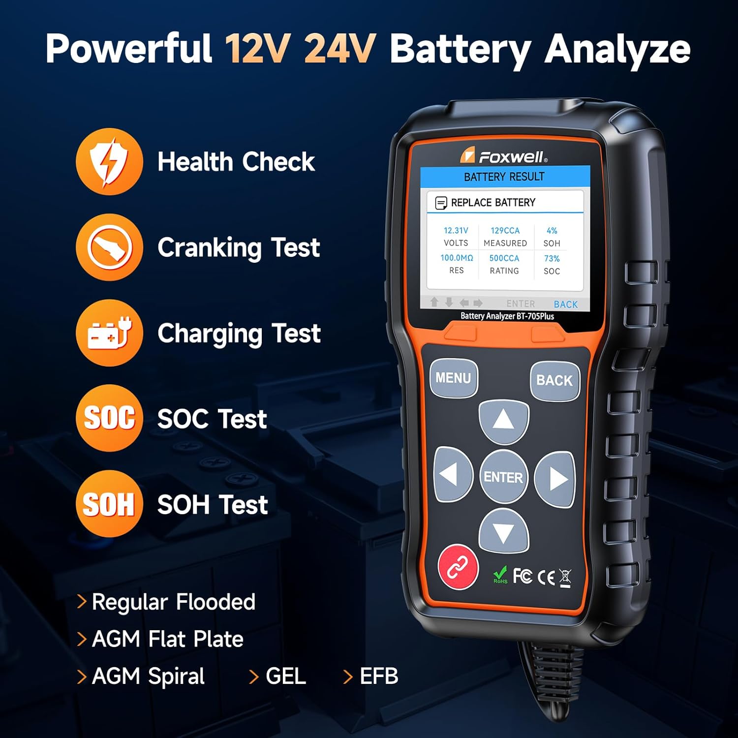 • Main Features of BT705 Plus You Should Know - The FOXWELL BT705 Plus battery tester provides comprehensive test for 12V 24V batteries ranging from 100-2000 CCA. It supports regular flooded, AGM flat plate/spiral, and GEL batteries. This battery checker tester accurately measures battery state(SOH), starter state, cranking voltage & time, CCA, charge state(SOC), alternator output, and no-load/loaded voltage. Effectively assessing the condition of the battery, cranking, and charging systems.
