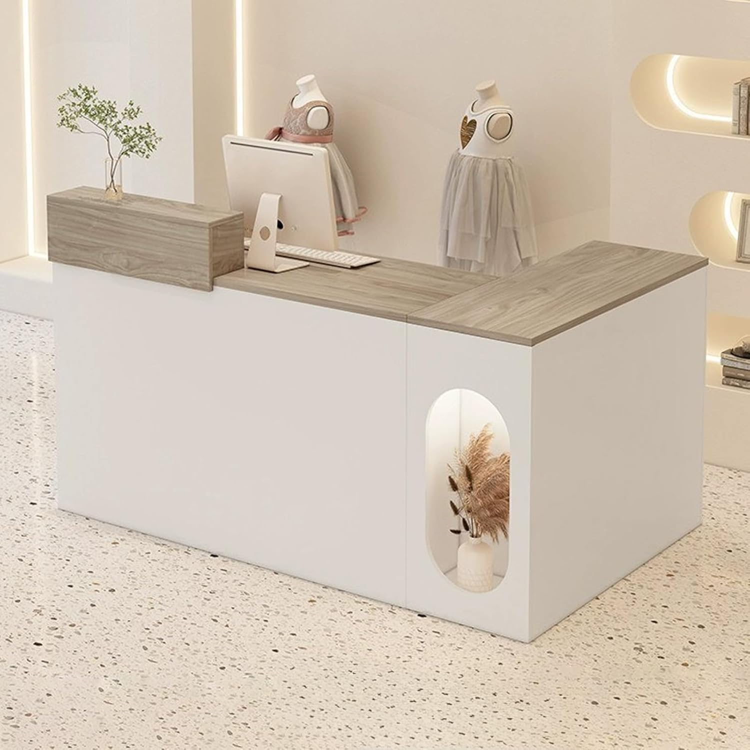 JKGHK reception counter selects board materials, thick and practical materials, which are not easy to bend or crack, and are stable and practical.The retail counter has built-in storage design, which instantly improves the store style and can be embedded with storage.The arc tabletop has finely polished edges and corners, which are round and natural to avoid bumps.Specifications:Color: Light gray , Natural , Dark gray , White+natural , Cream+gray , Cream , WhiteMaterial: WoodInstallation or not: YesOverall Dimensions: 120/140×90×105cm / 47.2/55.1×35.4×41.3inNote:1. There are only Reception Desk, other products are shooting props;2. Note: Due to the particularity of the furniture, there will be slight errors in the finished product, which is normal. The data is for reference only and must be based on the actual product. We hope for your understanding!3. While we display colors as accurately as possible, due to differences in computer monitors, colors may vary.