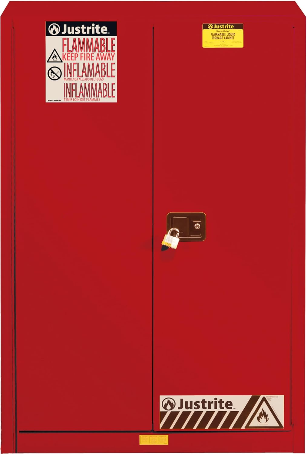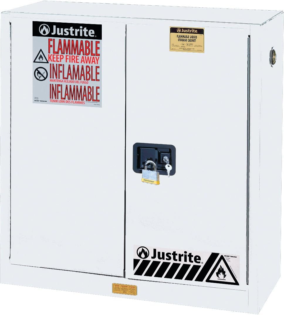 Protect workers, reduce fire risks, and improve productivity. Store flammable fuels and chemicals in code-compliant Justrite safety fireproof cabinets.Justrite cabinets are constructed of sturdy 18-gauge (1-mm) thick double-wall, welded steel. They have 1-1/2-in (38-mm) of insulating air space for fire resistance. A Justrite fireproof cabinet has high-performance, self-latching doors. They close easily and securely for maximum protection under fire conditions. The doors include a three-point stainless steel bullet latching system. A fail-safe closing mechanism ensures they work every time. For added security, the handle comes with a cylinder lock and key set, or accepts an optional padlock.Manual-close door(s) open to a full 180 degrees and self-latch when pushed closed. Self-close door(s) shut and latch automatically when a fusible link melts at 165F (74C) under fire conditions. A unique, concealed self-closing mechanism offers obstruction-free access to contents. All door styles meet OSHA and NFPA 30. Self-close door styles also meet NFPA 1 and the International Fire Code.Shelf versions feature adjustable patented SpillSlope galvanized steel shelves. These shelves direct spills to the back and bottom of a leakproof bottom sumpJustrite cabinets also feature:• Dual side vents with flame arresters• Four adjustable feet for perfect leveling• A grounding connector• A reflective trilingual warning label• A durable lead-free powder-coat finish that provides excellent chemical resistanceJustrite flammable cabinets are FM approved. They are proudly made in the USA, and come with a ten-year warranty.
