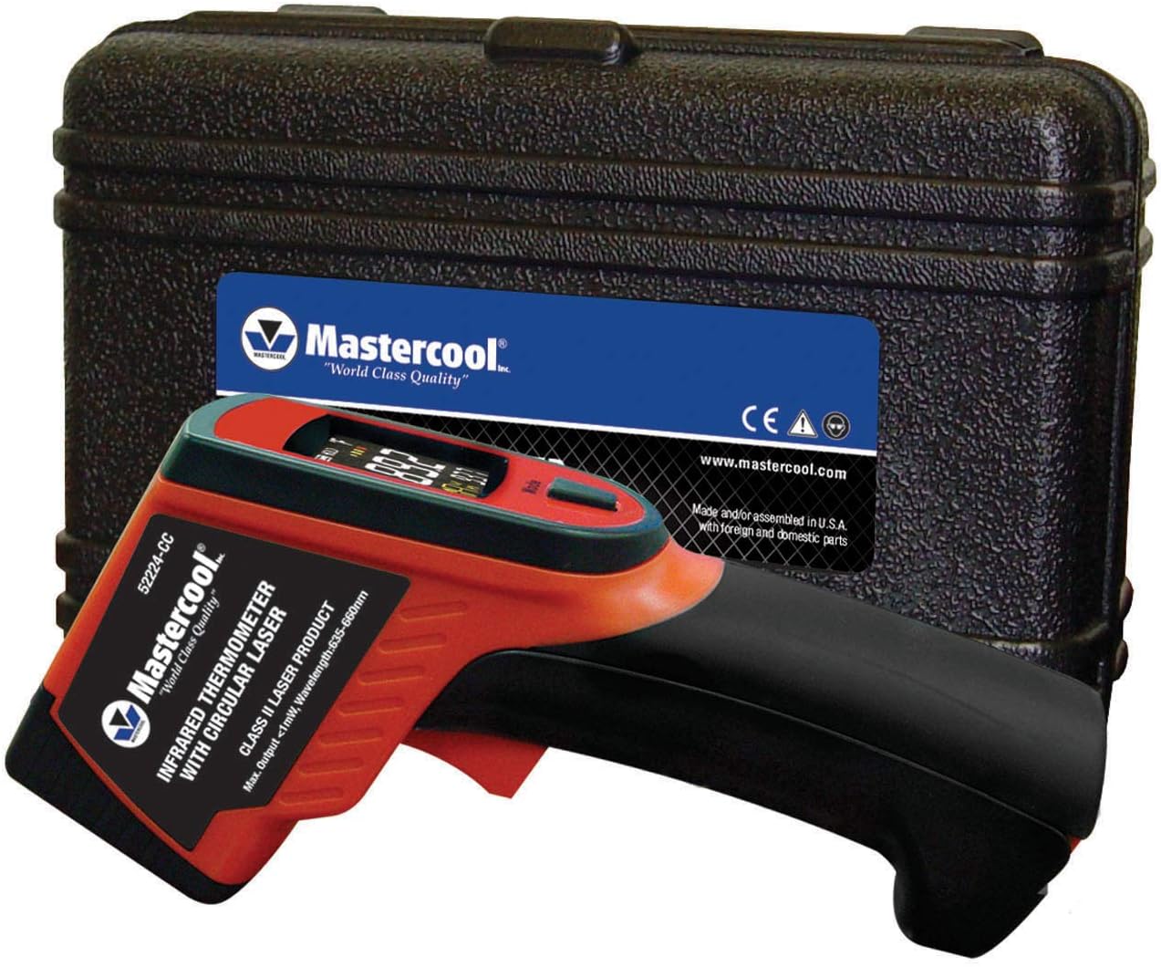Mastercool’s infrared thermometer with circular laser offers laser targeting accuracy, an enhanced back-lit color LCD display and an expanded temperature range. The compact design is simple to use, requiring just a simple press of the trigger to begin reading temperatures and easy to store, in the convenient plastic storage box included. Mastercool’s infrared thermometer with circular laser comes with 2 AAA batteries, instruction manual, 1” dial thermometer with a temperature range of -76 to 1400˚F (-60 to 760˚C) and a plastic molded carrying case. Specifications: Non Contact Temperature Range: -76 to 1400˚F (-60 to 760˚C) / Field Of View: 12 : 1 / Display Illumination: Backlit LCD Color Display / Target Indicator: Circular Laser Spot / Emissivity: 0. 95 / Resolution: 0. 1˚F / 0. 1˚C / Accuracy: +/-2˚C (4˚F) or +/-2% of reading / Response Time: 1 second / Power Off: Automatic after 15 seconds / Battery: 2 AAA / Battery Life: Approximately 14 hours