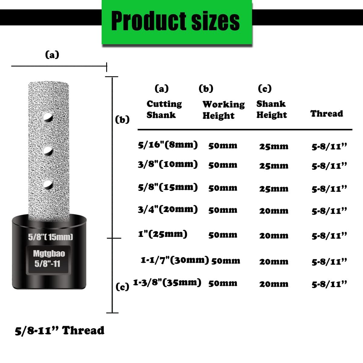 You will find it is very useful when you are: Replacing old faucets to standard one, because they require a larger hole. Tiling wall for bathroom and kitchen plumbing. Cutting circles in tiles to fit the pipes because it is super easy to use and it does great job in enlarging, shaping, trimming holes in hard materials. You will get beautiful smooth perfect holes easily. Application: Enlarge, shape and/or round bevel existing holes in Porcelain, Hard Ceramic, marble and granite Diamond Finger Milling Bit Specifications: Diameter:5/8”( 15mm). Max hole depth: 2 inch (50mm). Total Length: 2.95 inch (75mm) Thread: 5/8-11 for most angle grinders. Note: Mgtgbao direct shop have Available Diamond Milling Bit diameter: Dia 8mm, 10mm, 15mm, 20mm, 25mm, 30mm, 35mm, you can choose what you need. Diamond Beveling Chamfer Bits Specification: Diameter: : 1 -1/2 (38mm) Threads: 5/8-11 inch Grit:#70/80 Degree:60 High:45mm Packaging include: 1pc 5/8 inch ( 15mm) diamond finger drill bits. 1pc 1 -1/2 (38mm) Diamond chamfer bit. 1Pc Adapter 5/8 - 11 inch to 3/8 inch Hex Shank Warming Tips for use: Take your time, do not force the bit, you will get holes without chips, bumps or scratches. If your target material is expensive, do some test holes in scrap to get the feel for it before you do the job.