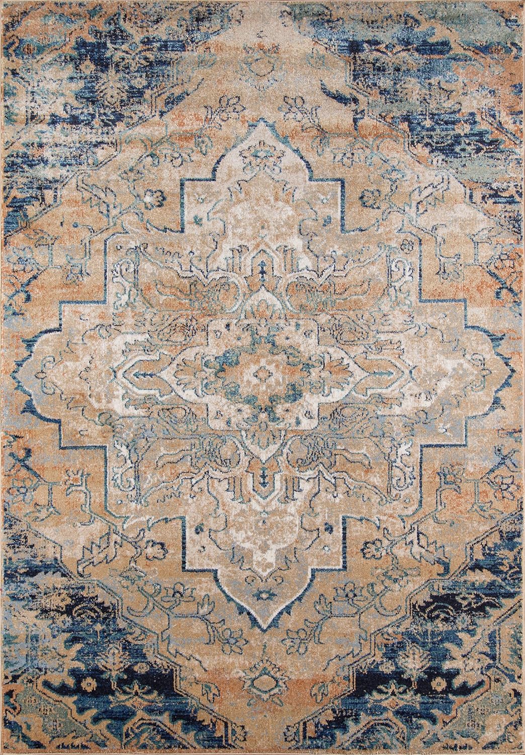 With a distressed finish reminiscent of antique carpets, the ornate Old World elements of this decorative area rug collection create a classic centerpiece for formal and casual interior floors. Intricate curling floral motifs are artfully arranged around a center medallion in shades that range from neutral ivory and beige to denim blue and rose red. Power-loomed in Turkey of plush polypropylene-polyester threads, this traditional floorcovering is artfully crafted for comfort and durability.