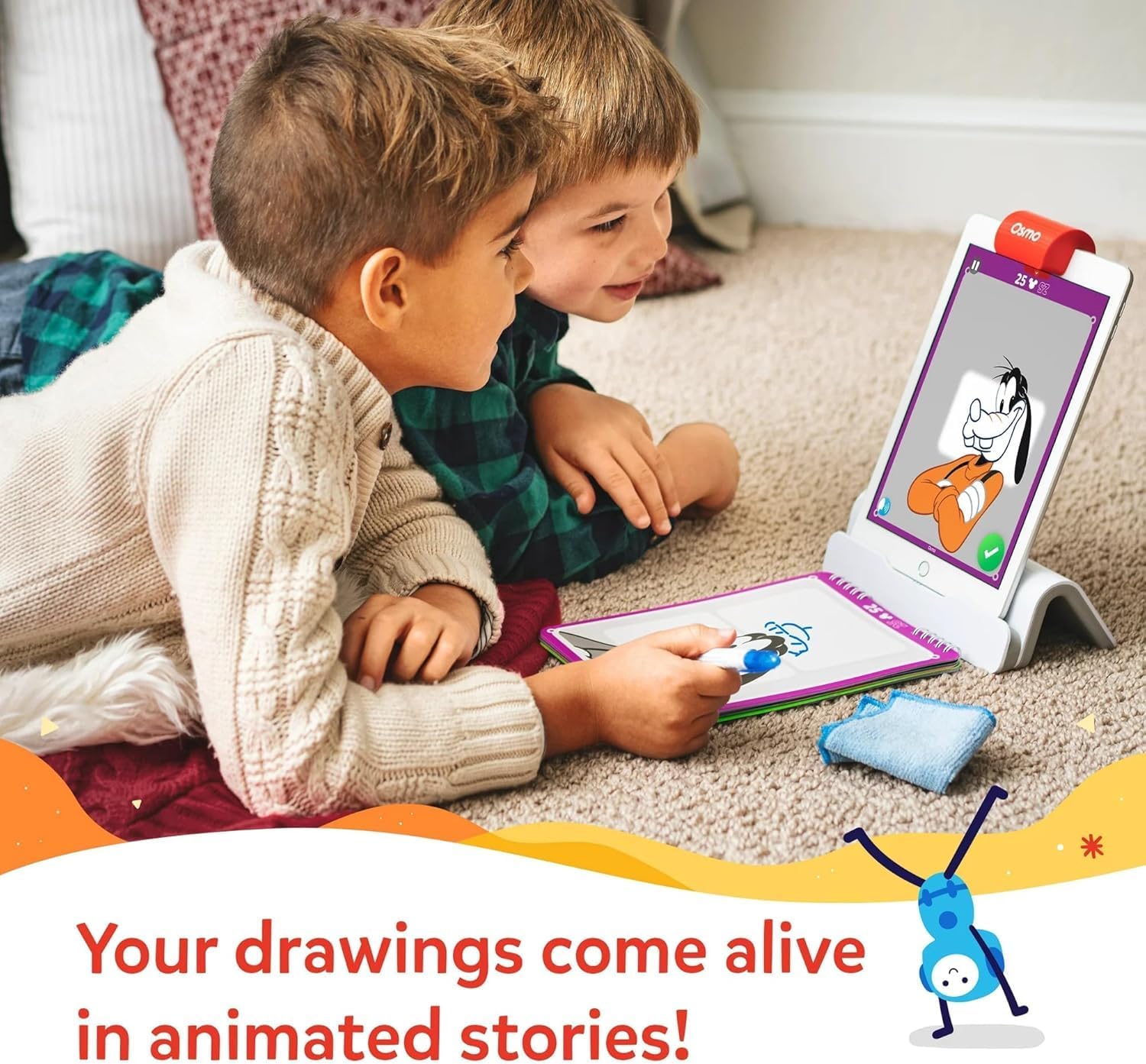 Osmo Super Studio Mickey Mouse Drawing Set - Bundle with Osmo Base, Mickey and Friends Learn to Draw Book, Coloring Pages, Stickers, More | Osmo iPad Drawing Board for Kids. This learn to draw set for kids includes an Osmo Super Studio base, a Mickey Mouse drawing board, and a dry-erase marker. Connect the Osmo base to your iPad and watch your Mickey and Friends coloring pages featuring Mickey Mouse, Donald, Goofy, and more come to life on the screen! This learn to draw activity set is great to teach your child about listening, drawing, observation, and more problem solving skills all alongside their favorite Disney characters. Officially licensed Osmo Mickey Mouse learn to draw activity set for kids. Set also includes Mickey Mouse stickers and a Beach Kids castle door hanger.