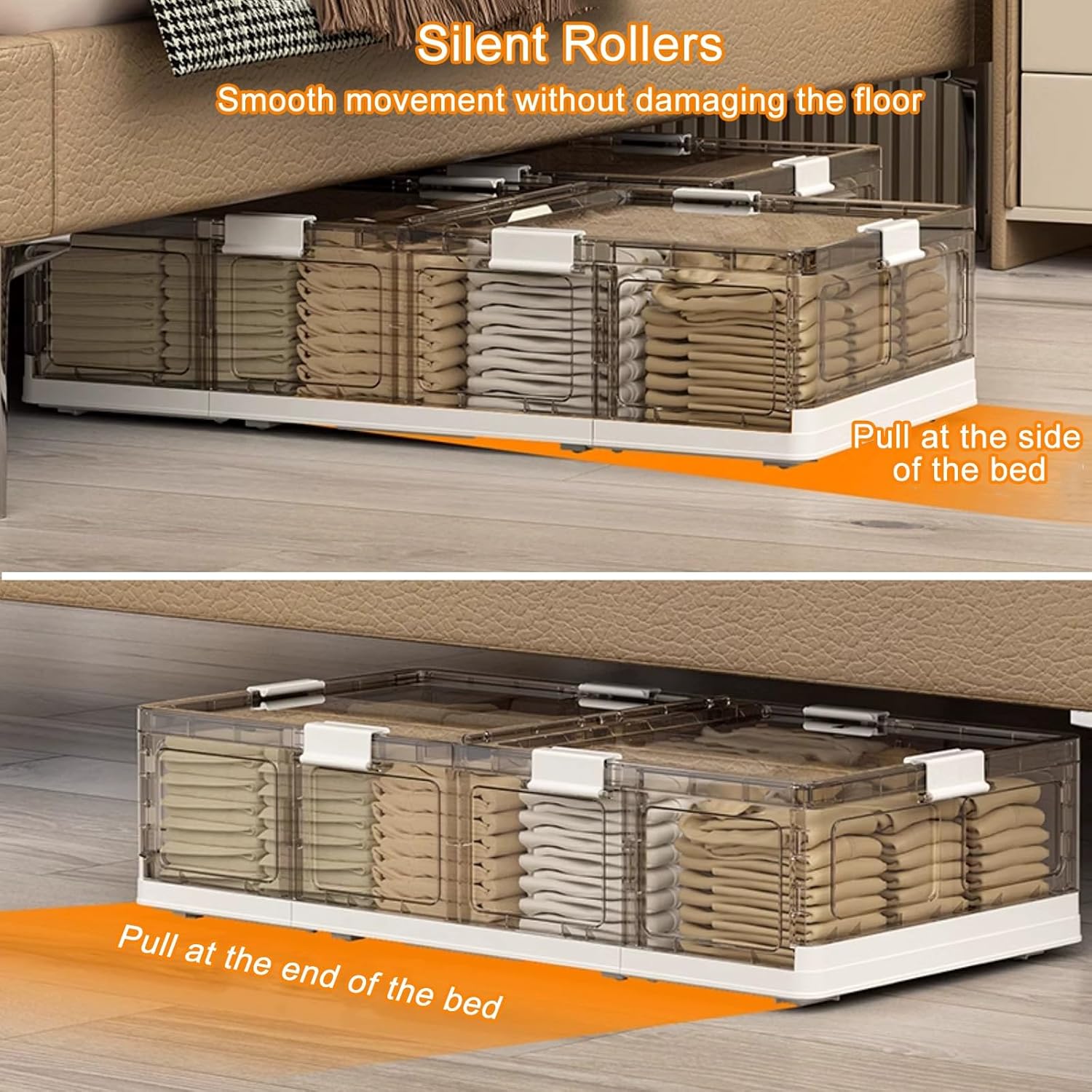 The under bed storage container has a double door design with locks on both sides for easy opening or locking. It can also be used conveniently while keeping the contents inside clean and tidy for a long time.This under-bed storage box can be folded and stored when not in use, making it easy to install and easy to organize, so no space is wasted.You can stack multiple under-bed boxes for use, and the card slot on the top of the lid keeps the box stable, so you can use it in different positions at any time.The function of the wheels allows this under-bed storage container to be easily pulled out for bedroom organization use.Specification:Product Name: Underbed Storage BoxMaterial: PPColor: BrownProduct Size: 64 x 42 x 15.5cm/25.2 x 16.5 x 6.1in64 x 42 x 18.5cm/25.2 x 16.5 x 7.3in64 x 42 x 20.5cm/25.2 x 16.5 x 8.1in82 x 42 x 15.5cm/32.3 x 16.5 x 6.1in82 x 42 x 18.5cm/32.3 x 16.5 x 7.3in82 x 42 x 20.5cm/32.3 x 16.5 x 8.1inAssembly required: UnfoldPackage includes: 1 * Under Bed Storage Drawer